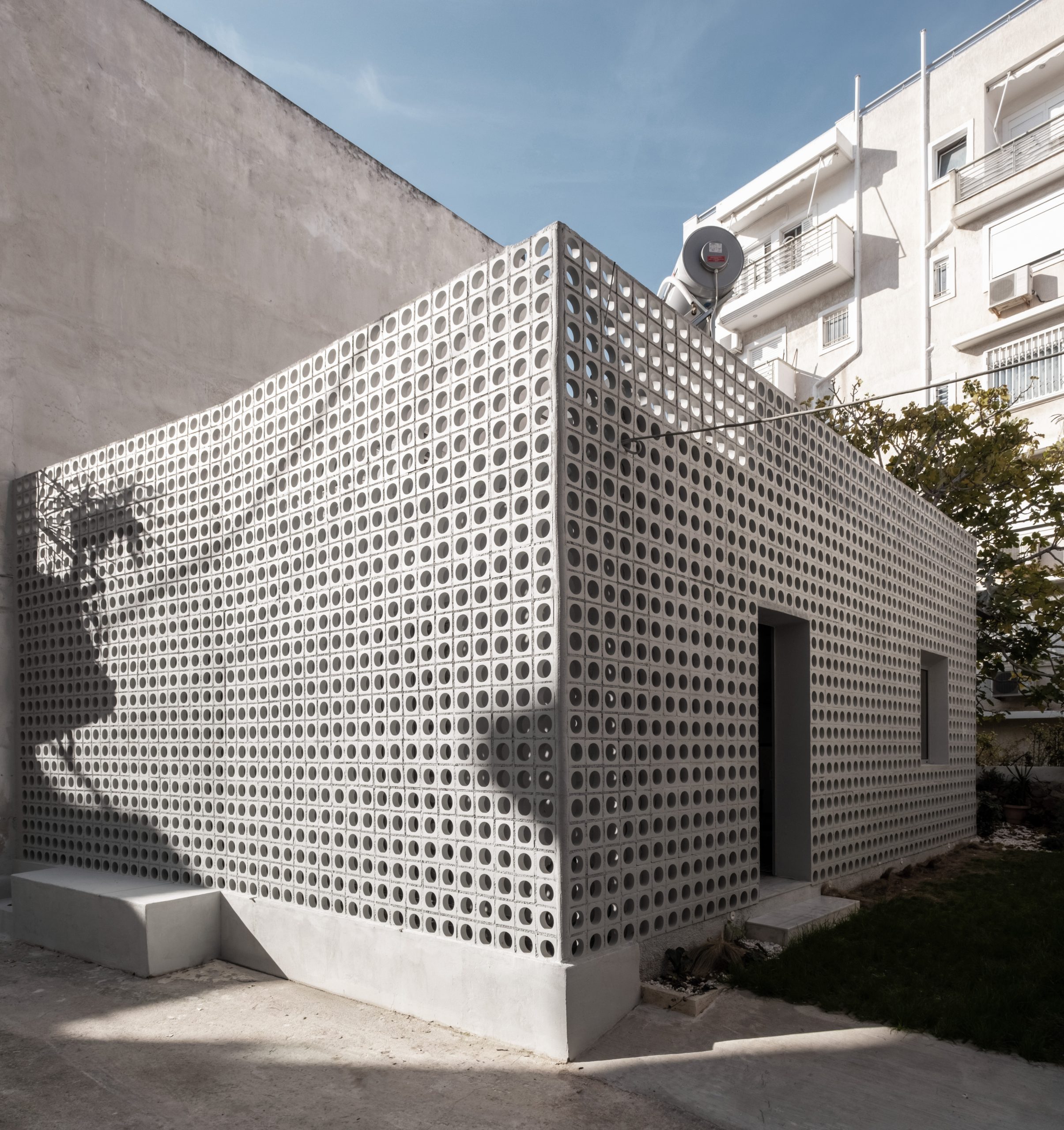 The reconstruction introduced an openwork ceramic façade that screens domestic life from the street while creating shade on the building’s southern side. In time, grapevines will cover the ceramic wall, echoing traditional Athenian courtyards. All windows were converted into sliding doors, dissolving the boundary between the interior and the garden with its fig tree.