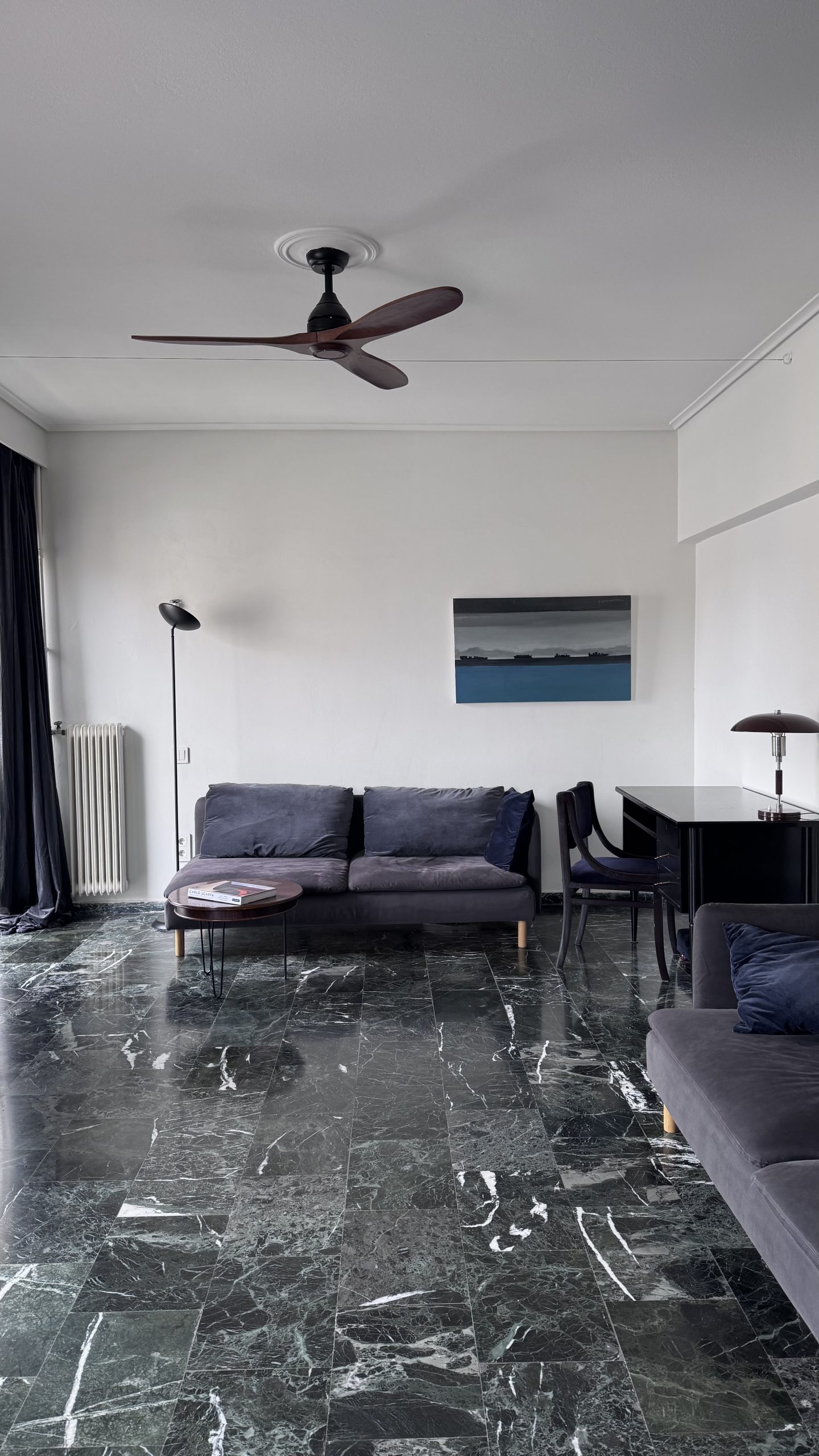 This three-sided apartment in the southern suburbs of Athens overlooks Mount Egaleo and the Acropolis. A typical Greek polykatoikia with modernist aspirations, featuring spacious balconies and marble floors from the Ioannina quarry, the building captures the essence of the Athenian Riviera. The renovation opened up the space between kitchen and living room, illuminating the communal area with three panoramic windows. The bathroom was divided into two separate spaces for practicality, and an old built-in wardrobe was transformed into a child’s playhouse. The distinctive Attic light informed the choice of matte white for walls and ceiling. Mirrors and marble reflections enhance the overall lightness of the space. Traditional glass blocks unite the bathrooms through shared light. Various hidden and visible lighting options allow for flexible arrangement of the space during evening hours